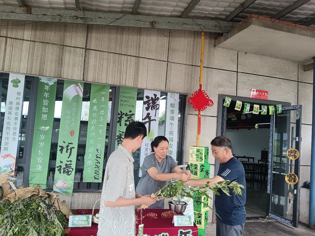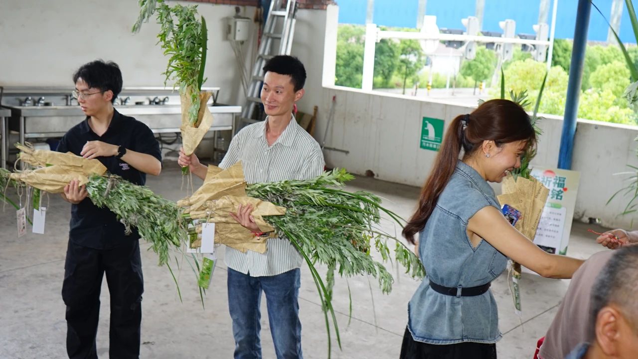 青青艾草,福瑞盈門。員工們親手扎制艾草花束,艾葉的辛香與菖蒲的挺拔相映成趣。這親手制作的“百福草束”,是傳統(tǒng)“招百福”吉物的演繹。長桌鋪陳,青翠的艾葉與淡雅的菖蒲整齊排列,綠意盎然。三銘領導與員工分發(fā)艾草花束,將祝福與期許細細纏繞。